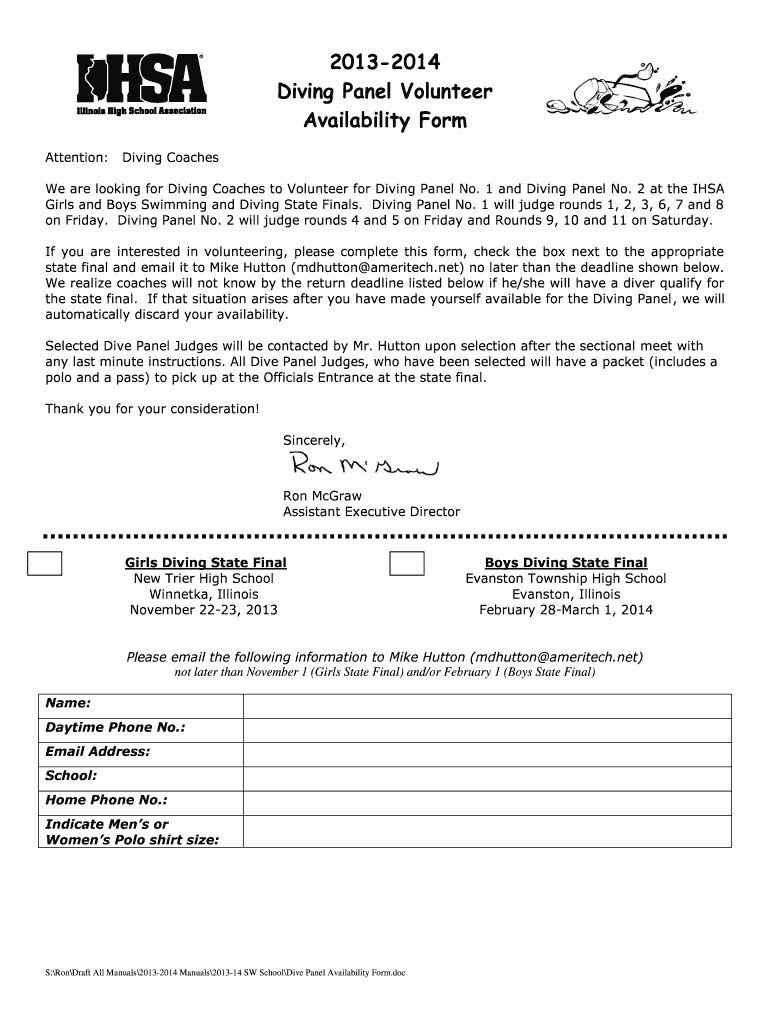 2013-2014 Diving Panel Volunteer Availability Form Attention: Diving Coaches We are looking for Diving Coaches to Volunteer for Diving Panel No. 1 and Diving Panel No. 2 at the IHS Girls and Boys