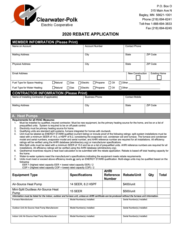 P.O. Box O 315 Main Ave N Bailey, MN 566211001 Phone (218) 6946241 Toll free 18886943833 Fax (218) 69462452020 REBATE APPLICATION MEMBER INFORMATION (Please Print) Name on AccountAccount NumberContact
