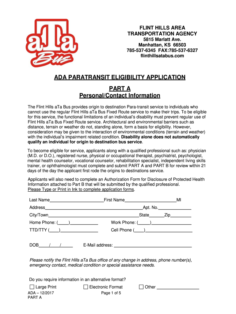Get the free ADA Paratransit Eligibility Application Part A - Riley County