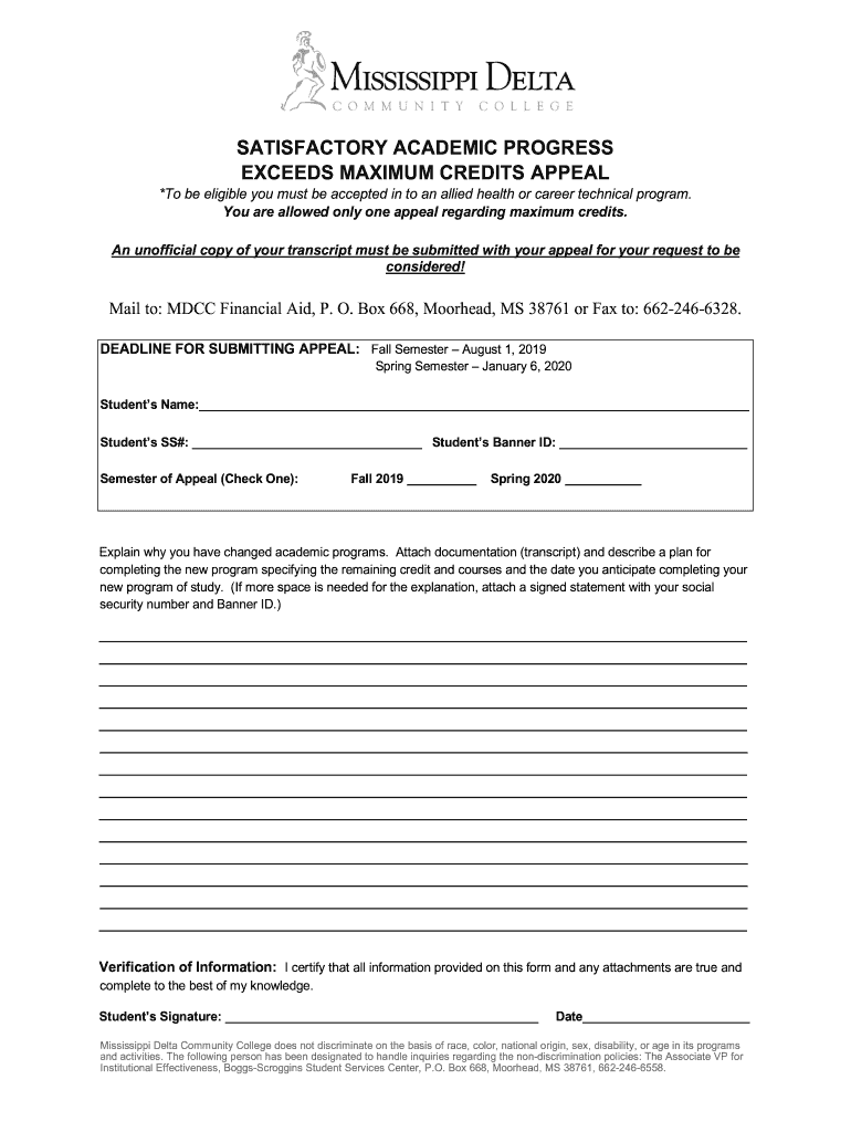 SATISFACTORY ACADEMIC PROGRESS EXCEEDS MAXIMUM CREDITS APPEAL *To be eligible you must be accepted in to an allied health or career technical program. You are allowed only one appeal regarding maximum