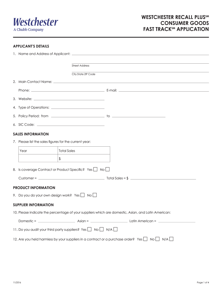 WESTCHESTER RECALL PLU SSM CONSUMER GOODS FAST TRACKS APPLICATION APPLICANTS DETAILS 1. Name and Address of Applicant:Street Addressing State ZIP Code2. Main Contact Name:Phone:Email:3. Website: 4.