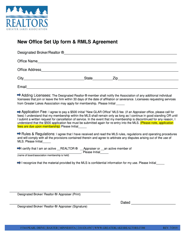 New Office Set Up form & RMS Agreement Designated Broker/Realtor Office Name Office Address City State Zip Email Adding Licensees: The Designated Realtor member shall notify the Association of any