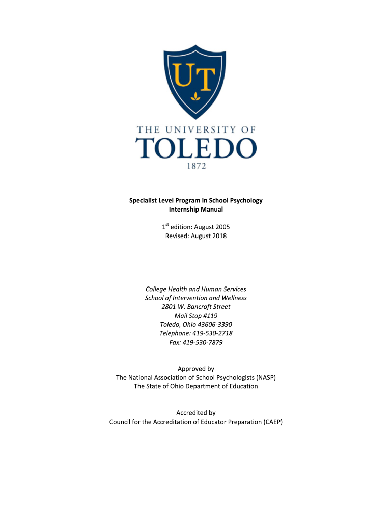 Specialist Level Program in School PsychologyInternship Manual1st edition: August 2005Revised: August 2018College Health and Human ServicesSchool of Intervention and Wellness2801 W. Bancroft Streetcar Stop #119Toledo, Ohio 436063390Telephone: 4195302718Fax: 4195307879Approved byte National Association of School Psychologists (NASA)The State of Ohio Department of EducationAccredited council for the Accreditation of Educator Preparation (CAMP)Table of ContentsProgram