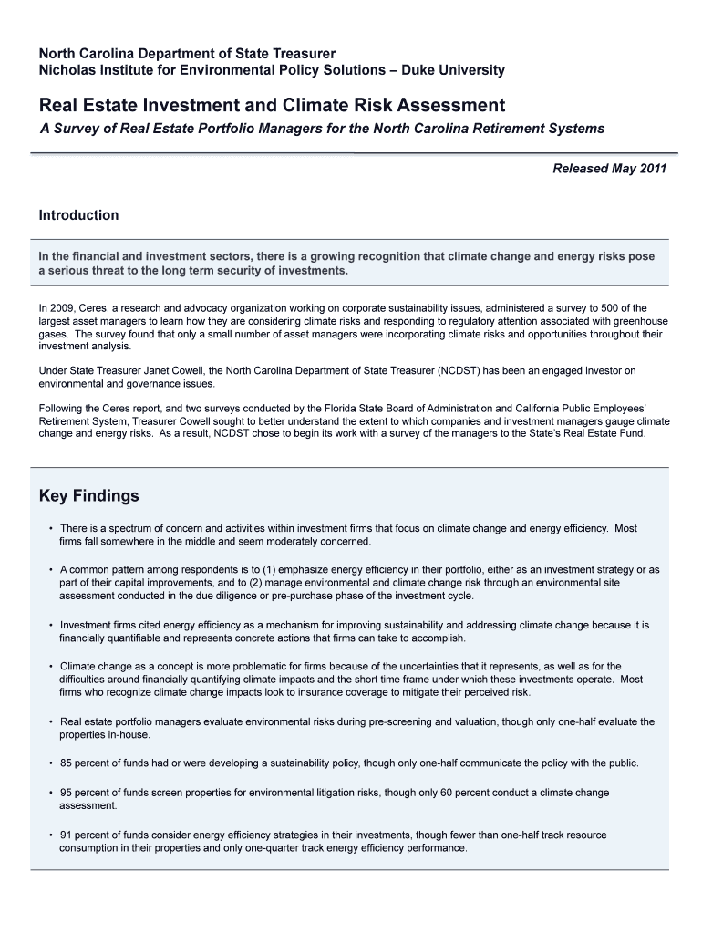 North Carolina Department of State Treasurer Nicholas Institute for Environmental Policy Solutions Duke UniversityReal Estate Investment and Climate Risk Assessment A Survey of Real Estate Portfolio