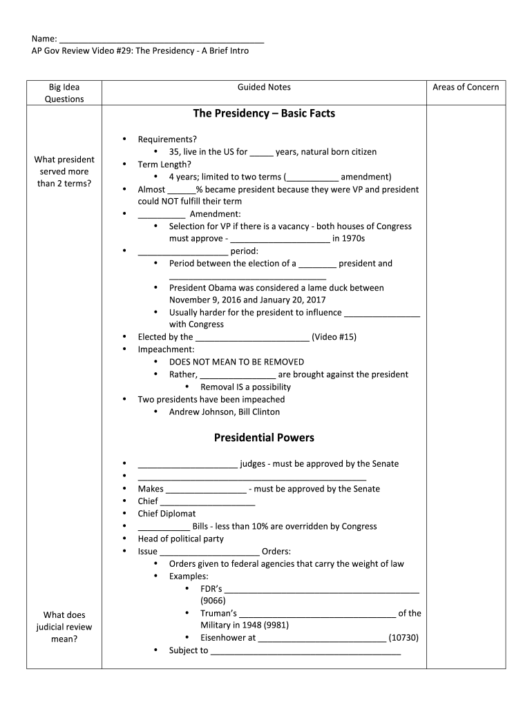 Name: APGovReviewVideo#29:ThePresidencyABriefIntro Divided Sidenotes AreasofConcern Questions ThePresidencyBasicFacts Requirements? 35,liveintheUSfor years, naturalborncitizen What president TermLength?