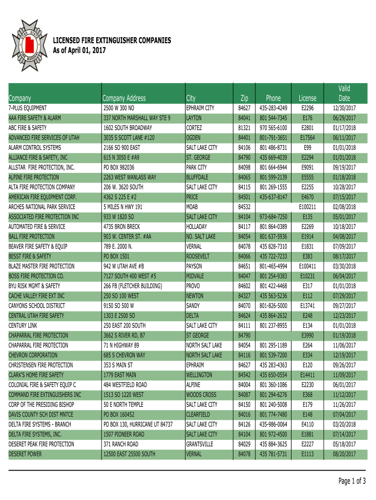 LICENSED FIRE EXTINGUISHER COMPANIES As of April 01, 2017CompanyCompany AddressCity7PLUS EQUIPMENT2500 W 300 NOAA AFIRE SAFETY & ALARM337 NORTH MARSHALL WAY STE 9ABC FIRE & SAFETY ADVANCED FIRE SERVICES