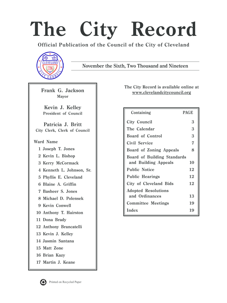 Official Publication of the Council of the City of Cleveland November the Sixth, Two Thousand and Nineteen Frank G. Jackson City Record is available online at