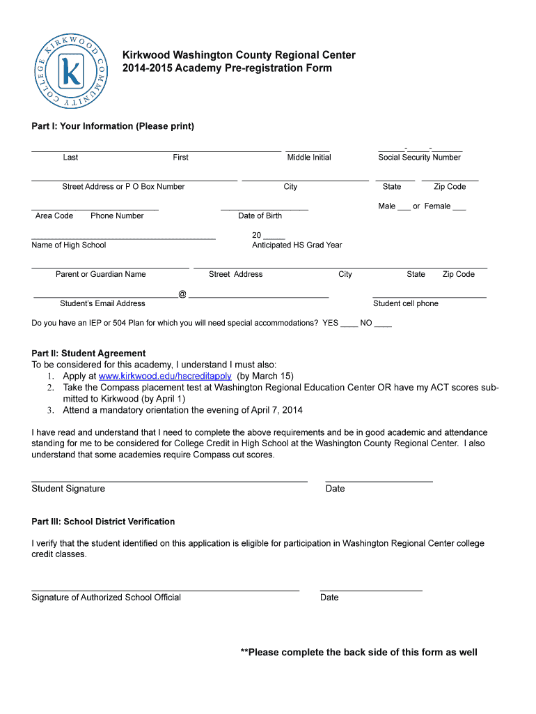 Kirkwood Washington County Regional Center 2014-2015 Academy Preregistration Form Part I: Your Information (Please print) Last First Middle Initial — Social Security Number Street Address or P O