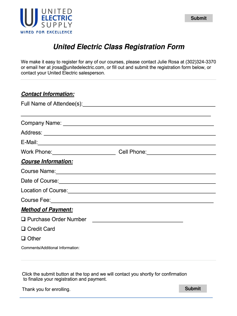 Submitted Electric Class Registration Form We make it easy to register for any of our courses, please contact Julie Rosa at (302)3243370 or email her at Rosa unitedelectric.com, or fill out and submit