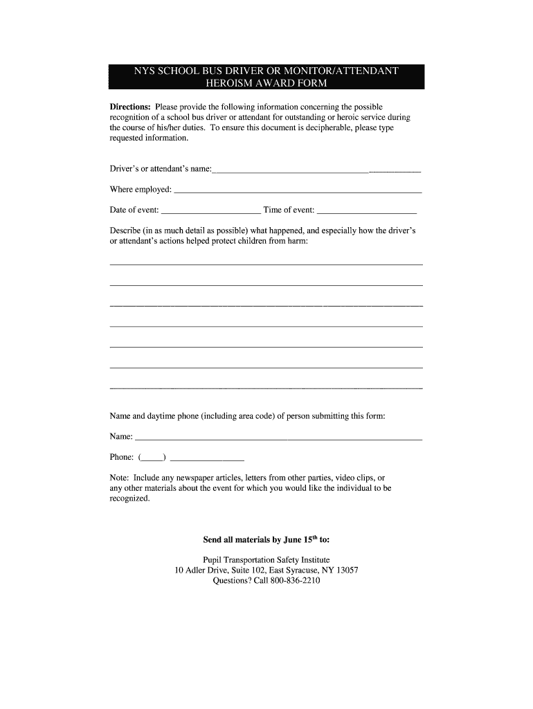 NYS SCHOOL BUS DRIVER OR MONITOR/ATTENDANT HEROISM AWARD FORM Directions: Please provide the following information concerning the possible recognition of a school bus driver or attendant for outstanding