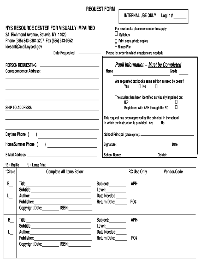 REQUEST FORM INTERNAL USE ONLY RESOURCE CENTER FOR VISUALLY IMPAIRED 2A Richmond Avenue, Batavia, NY 14020 Phone (585) 3435384 x207 Fax (585) 3430652 DeSantis mail.nosed.gov Date Requested in #For