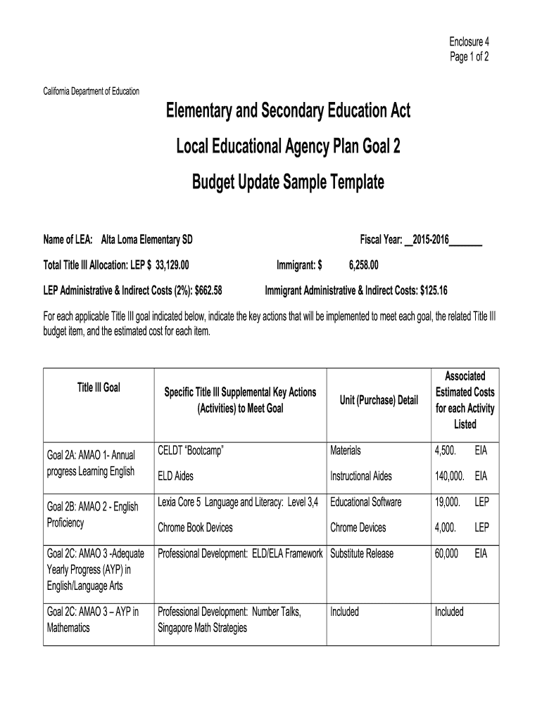 Enclosure 4-Page 1 of 2 California Department of EducationElementary and Secondary Education Act Local Educational Agency Plan Goal 2 Budget Update Sample Template Name of LEA:Alta Coma Elementary