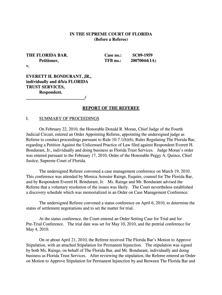 IN THE SUPREME COURT OF FLORIDA (Before a Referee)THE FLORIDA BAR, Petitioner, v. Case no.: TFB no.:SC091959 20070044(1A)EVERETT H. HONDURAN, JR., individually and d/b/a FLORIDA TRUST SERVICES, Respondent.