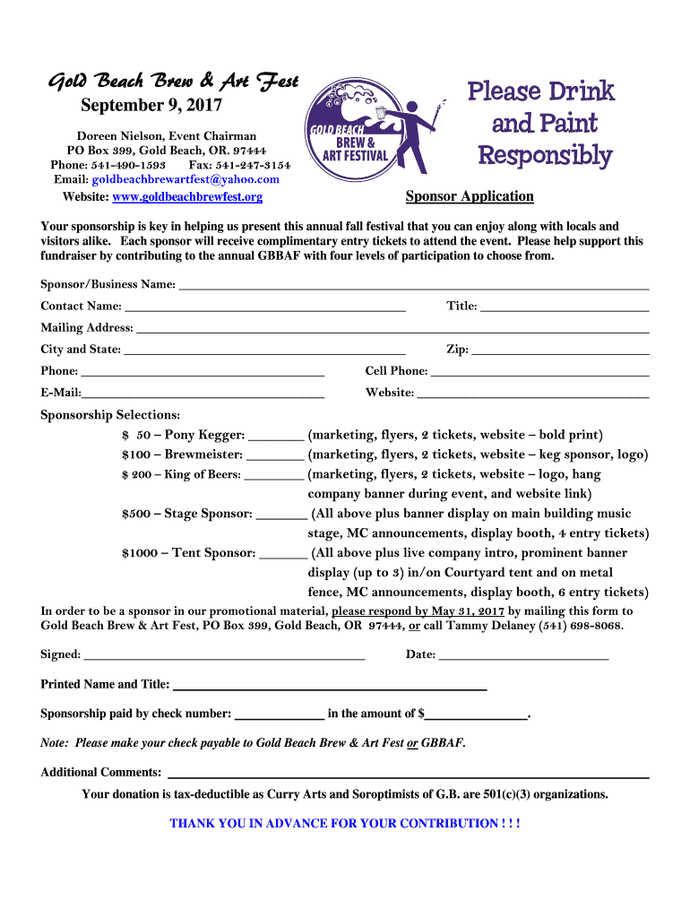 Gold Beach Brew & Art Fest September 9, 2017, Doreen Nielson, Event Chairman PO Box 399, Gold Beach, OR. 97444 Phone: 5414901593 Fax: 5412473154 Email: goldbeachbrewartfest yahoo.com Website: www.goldbeachbrewfest.orgSponsor
