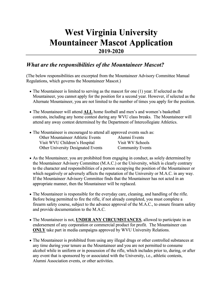 West Virginia University Mountaineer Mascot Application 20192020 What are the responsibilities of the Mountaineer Mascot? (The below responsibilities are excerpted from the Mountaineer Advisory Committee