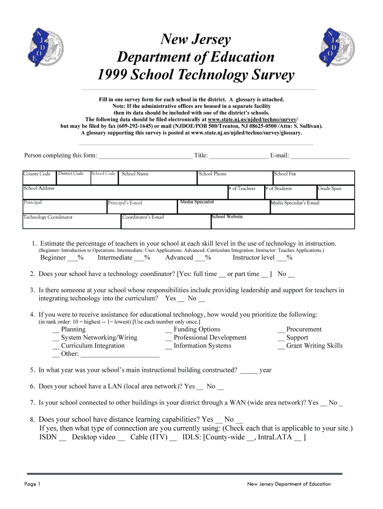 Get the free New Jersey Public School Technology Survey 1999 - state nj
