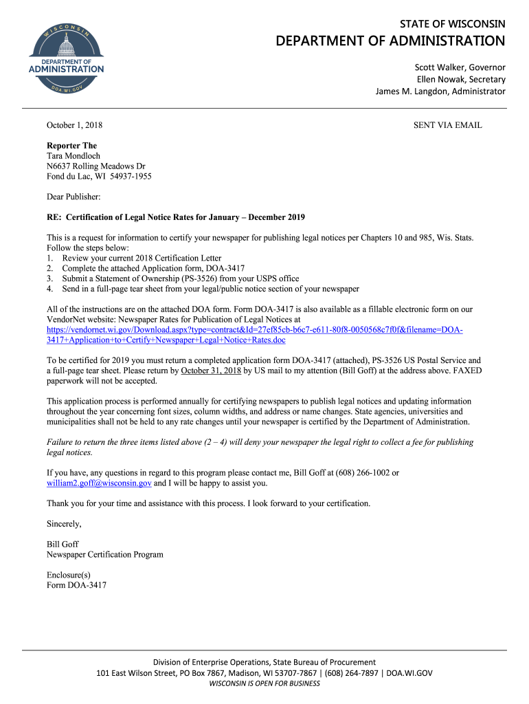 STATE OF WISCONSINDEPARTMENT OF ADMINISTRATION Scott Walker, Governor EllenNowak, Secretary James. Landon, Administrator October 1, 2018SENT VIA EMAILReporter The Tara Moloch N6637 Rolling Meadows