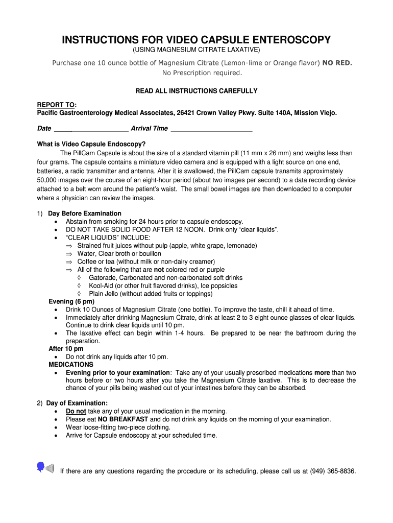 INSTRUCTIONS FOR VIDEO CAPSULE ENDOSCOPY (USING MAGNESIUM CITRATE LAXATIVE) Purchase one 10 ounce bottle of Magnesium Citrate (Lemon lime or Orange flavor) NO RED. No Prescription required. READ ALL