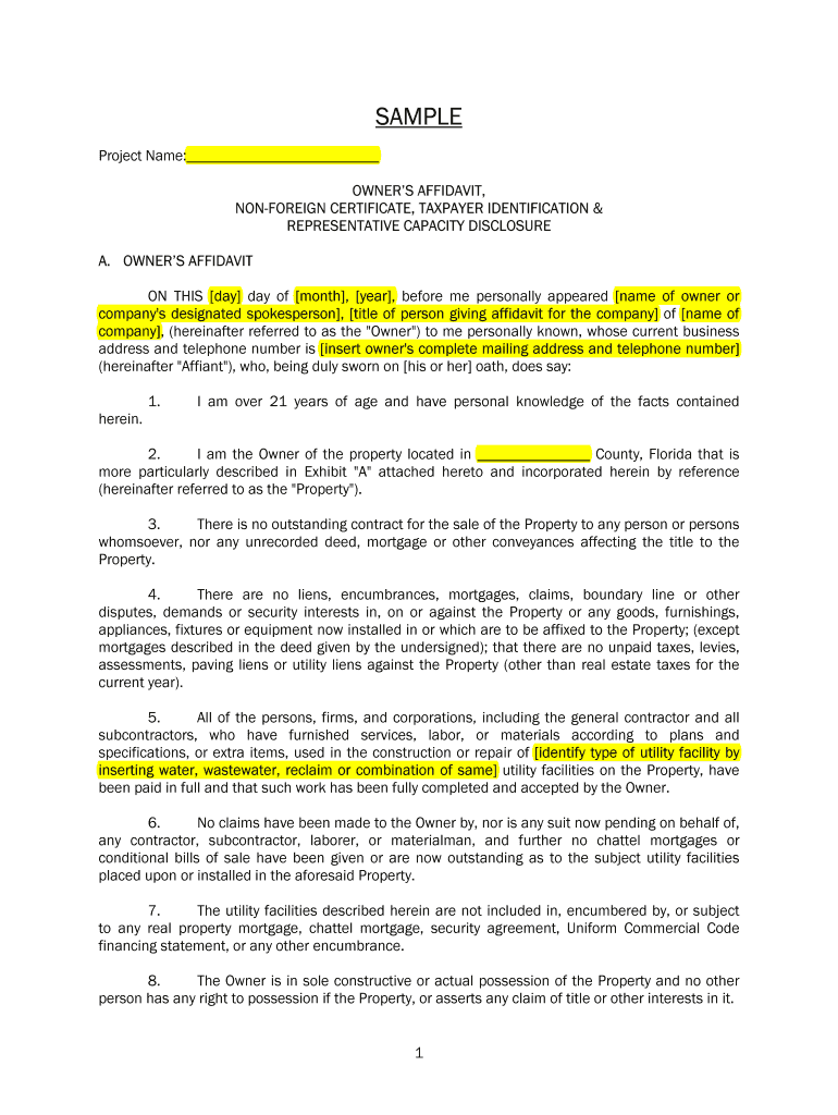 SAMPLE Project Name: OWNER S AFFIDAVIT, NON-FOREIGN CERTIFICATE, TAXPAYER IDENTIFICATION & REPRESENTATIVE CAPACITY DISCLOSURE A. OWNER S AFFIDAVIT ON THIS day of month, year, before me personally