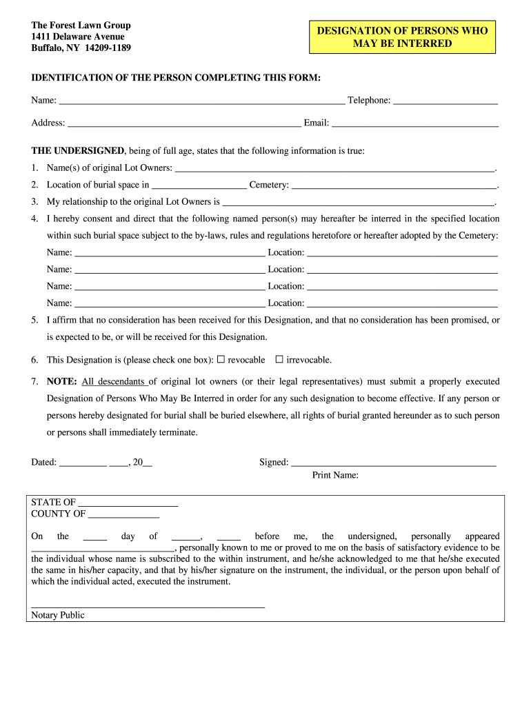 The Forest Lawn Group 1411 Delaware Avenue Buffalo, NY 142091189DESIGNATION OF PERSONS WHO MAY BE INTERREDIDENTIFICATION OF THE PERSON COMPLETING THIS FORM: Name: Telephone: Address: Email: THE UNDERSIGNED,