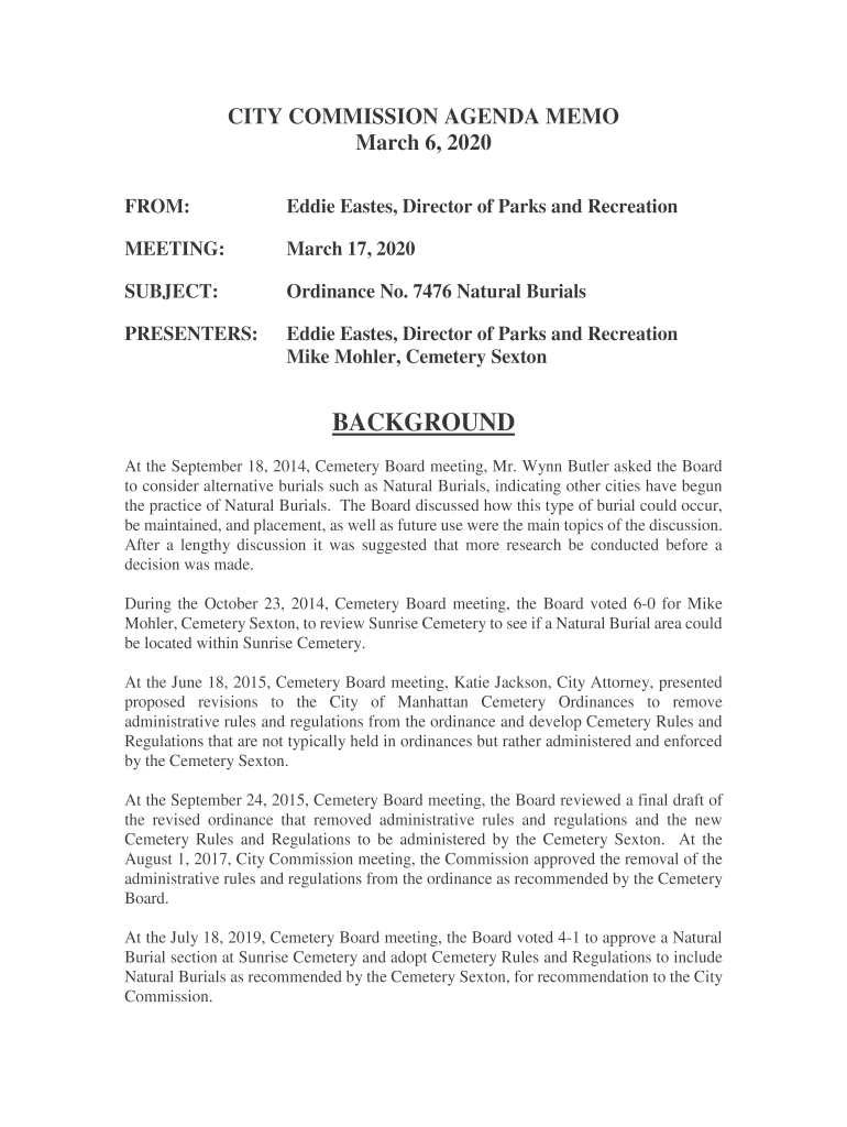FROM:Eddie Easter, Director of Parks and RecreationMEETING:March 17, 2020SUBJECT:Ordinance No. 7476 Natural BurialsPRESENTERS:Eddie Easter, Director of Parks