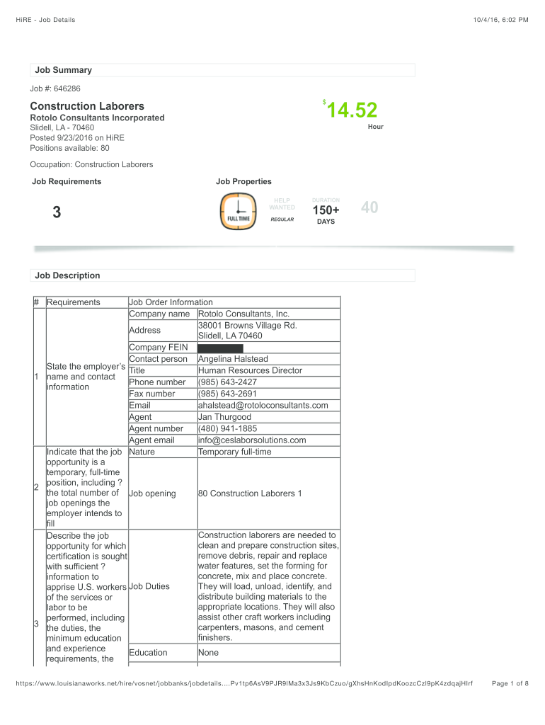 Hire Job Details10/4/16, 6:02 PM Job Summary Job #: $646286Construction Laborers Rotor Consultants Incorporated14.52 Hour Slidell, LA 70460 Posted 9/23/2016 on Hire Positions available: 80 Occupation: