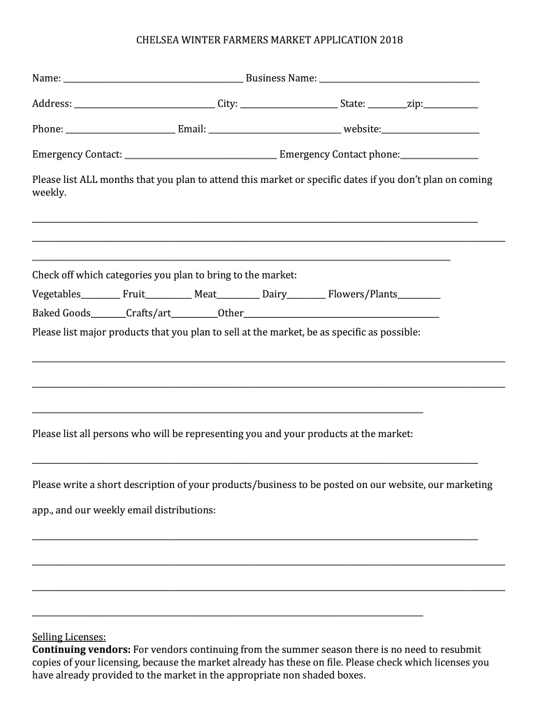 CHELSEA WINTER FARMERS MARKET APPLICATION 2018Name: Business Name: Address: City: State: zip: Phone: Email: website: Emergency Contact: Emergency Contact phone: Please list ALL months that you plan