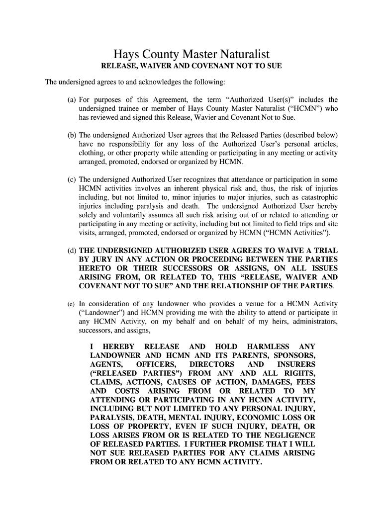 RELEASE, WAIVER AND COVENANT NOT TO SUE