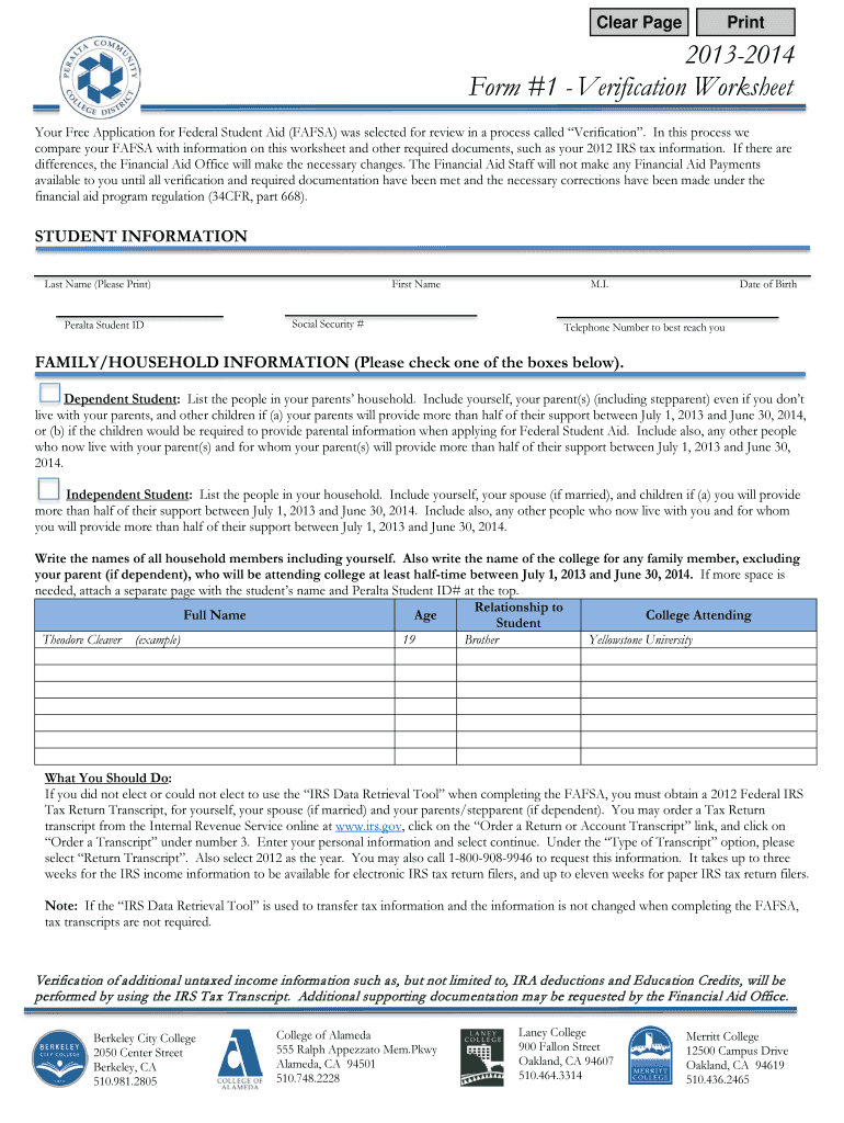 Get the free 2013-2014 Verification Worksheet