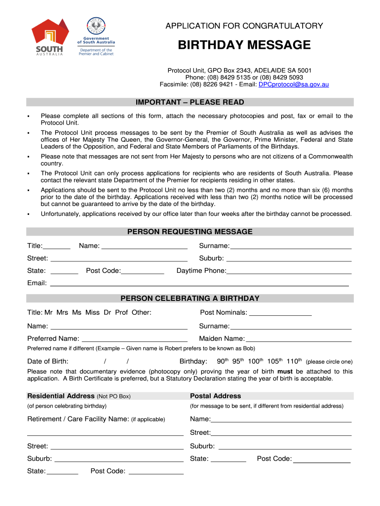 APPLICATION FOR CONGRATULATORYBIRTHDAY MESSAGE Protocol Unit, GPO Box 2343, ADELAIDE SA 5001 Phone: (08) 8429 5135 or (08) 8429 5093 Facsimiles: (08) 8226 9421 Email: DPC protocol SA.gov.important