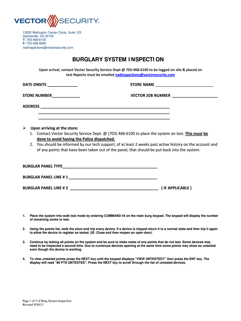 Get the free BURGLARY SYSTEM INSPECTION - Vector Security