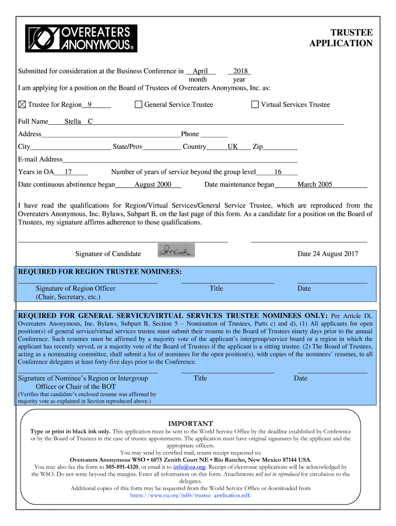 I am applying for a position on the Board of Trustees of Over eaters Anonymous, Inc. as: