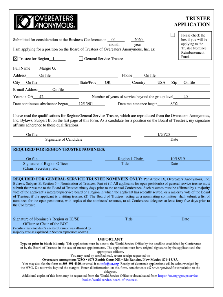 Get the free Trustee Application - Overeaters Anonymous