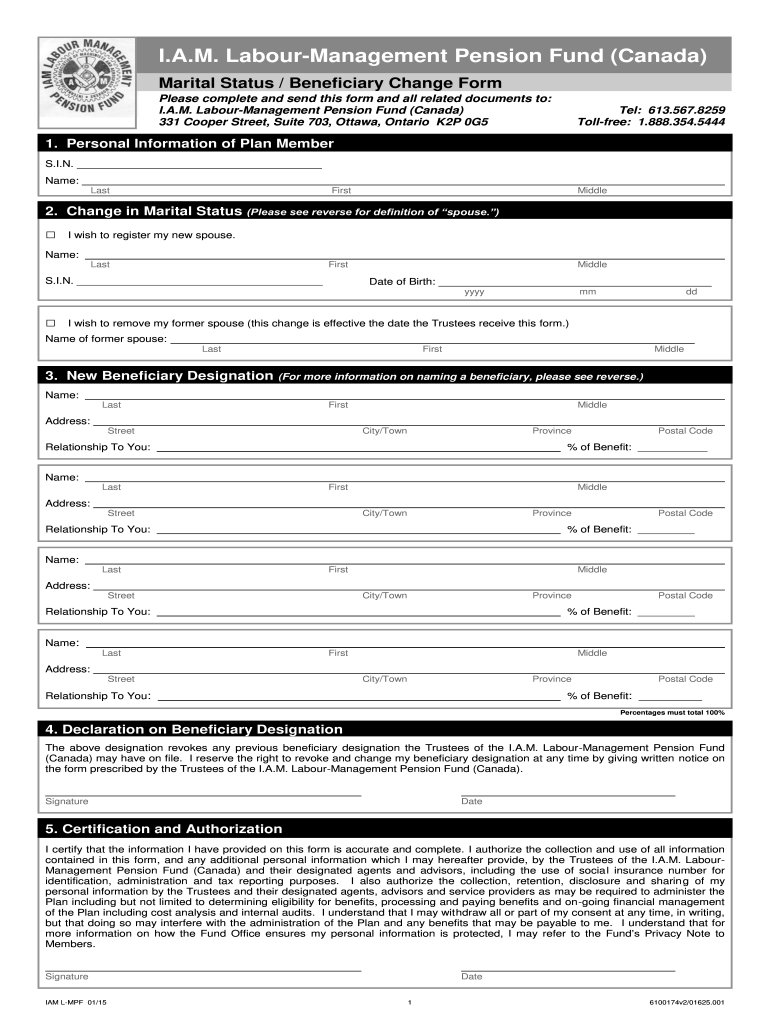 I.A.M. LabourManagement Pension Fund (Canada) Marital Status / Beneficiary Change Form Please complete and send this form and all related documents to: I.A.M. LabourManagement Pension Fund (Canada)