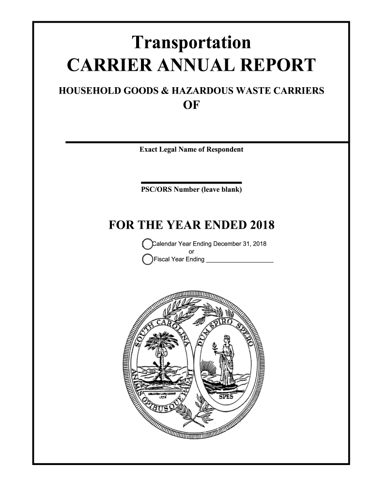 Transportation CARRIER ANNUAL REPORT HOUSEHOLD GOODS & HAZARDOUS WASTE CARRIERSOFExact Legal Name of Respondent PSC/ORS Number (leave blank)FOR THE YEAR ENDED 2018 Calendar Year Ending December 31,