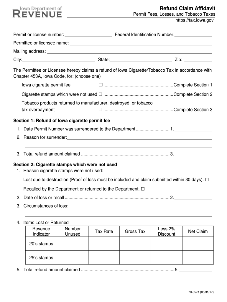 Refund Claim Affidavit Permit Fees, Losses, and Tobacco Taxes https://tax.iowa.gov Permit or license number: Federal Identification Number: Permitted or licensee name: Mailing address: City: State: