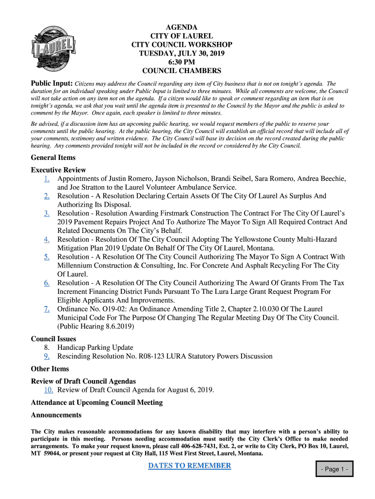 Get the free AGENDA CITY OF LAUREL CITY COUNCIL WORKSHOP TUESDAY, JULY ...