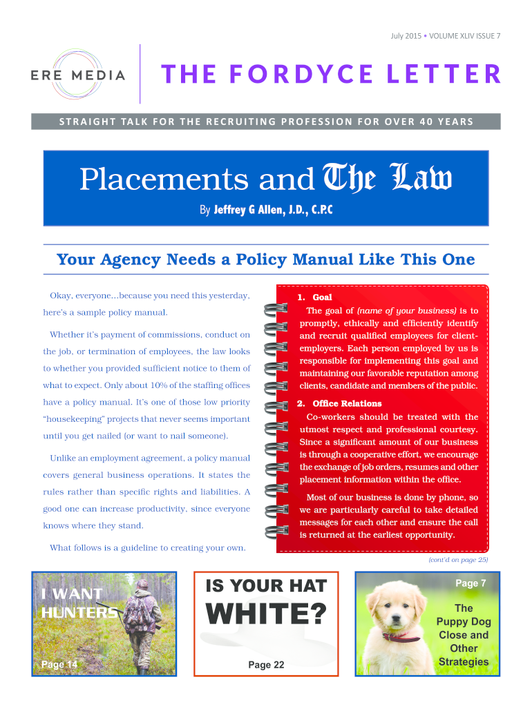 July 2015 VOLUME XCIV ISSUE 7S T R A I G H T TA L K F O R T H E R E C R U I T I N G P R O F E S S I O N F O R O V E R 4 0 Y E A RS Placements and Therapy Jeffrey G Allen, J.D., C.P. Your Agency Needs