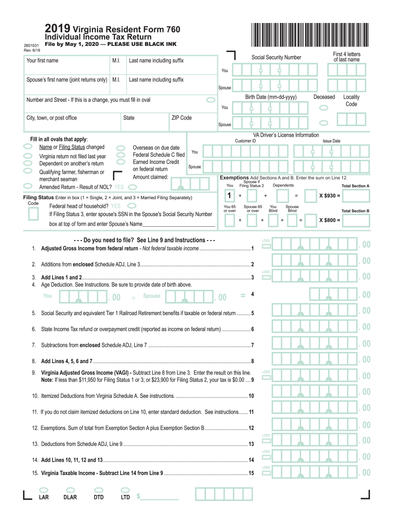 2019 Virginia Resident Form 760Individual Income Tax Return2601031 Rev. 6/19File by May 1, 2020, PLEASE USE BLACK INKRXUUVWQDPHM. I./DVWQDPHLQFOXGLQJVXI 6SRXVHVUVWQDPH MRLQWUHWXUQVRQOM. I./DVWQDPHLQFOXGLQJVXI