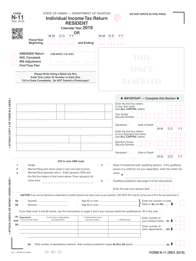 FORMULATE OF HAWAII DEPARTMENT OF TAXATIONN11(Rev. 2019)Individual Income Tax Return RESIDENT Calendar Year 2019MM Fiscal Year BeginningDDYY!! !! !! AMENDED Return NOT Carry back IRS Adjustment First