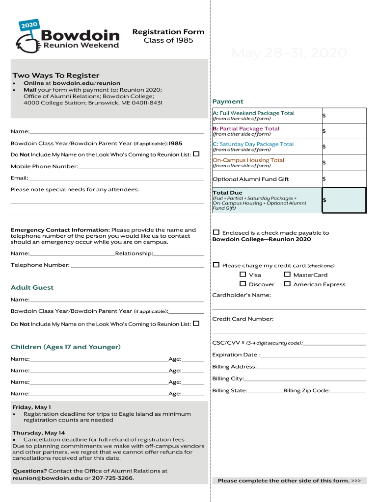 Registration Form Class of 1985May 2831, 2020 Two Ways To Register Online at bowdoin.edu/reunion Mail your form with payment to: Reunion 2020; OFCE of Alumni Relations; Borodin College; 4000 College