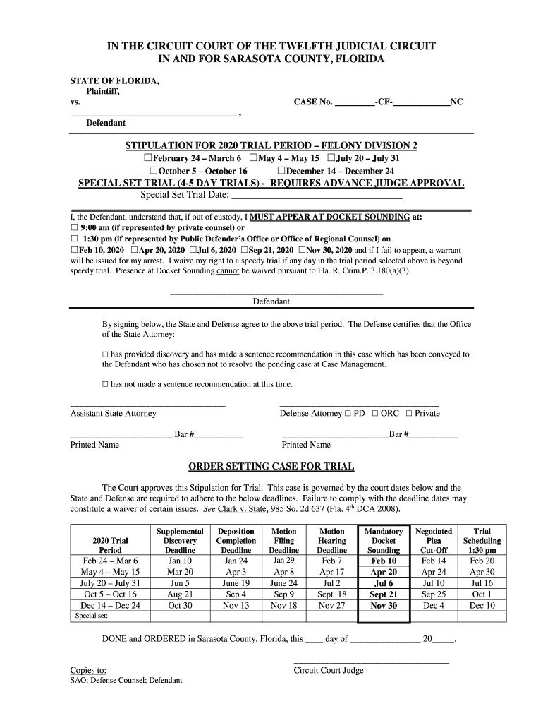 IN THE CIRCUIT COURT OF THE TWELFTH JUDICIAL CIRCUIT IN AND FOR SARASOTA COUNTY, FLORIDA STATE OF FLORIDA, Plaintiff, vs., Defendant CASE No. CF STIPULATION FOR 2020 TRIAL PERIOD FELONY DIVISION 2