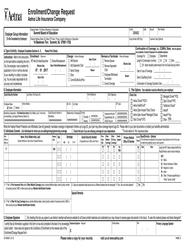Enrollment/Change Request Aetna Life Insurance Company Employer Group Information: (To Be Completed by Employer)Employer Name Full Name of Business or OrganizationControlEmployer Address (Street,