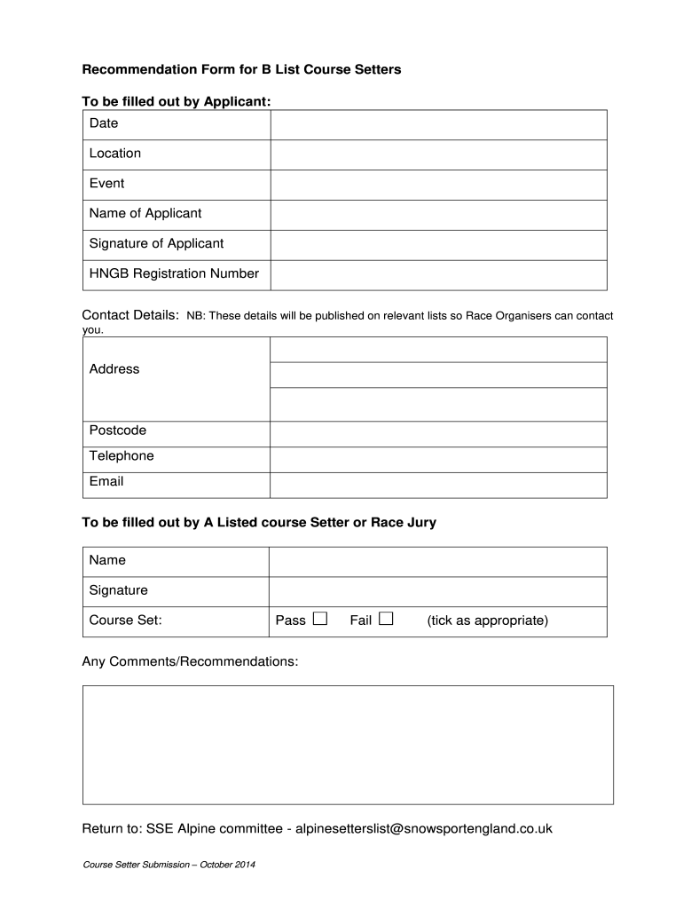 Recommendation Form for B List Course Setters To be filled out by Applicant: Date Location Event Name of Applicant Signature of Applicant HIGH Registration Number Contact Details: NB: These details