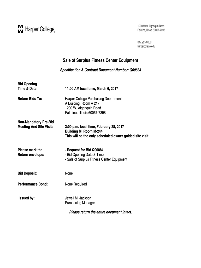 Sale of Surplus Fitness Center Equipment Specification & Contract Document Number: Q00884 Bid Opening Time & Date: Return Bids To:NonMandatory PreBid Meeting And Site Visit:11:00 AM local time, March