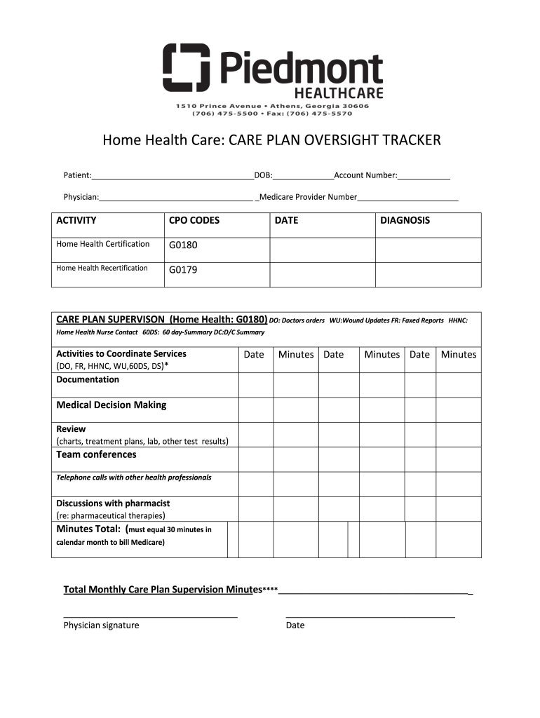 Home Health Care: CARE PLAN OVERSIGHT TRACKER Patient: DOB: Account Number: Physician: Medicare Provider Number ACTIVITY CPO Foreshore Health CertificationG0180Home Health RecertificationG0179DATECARE