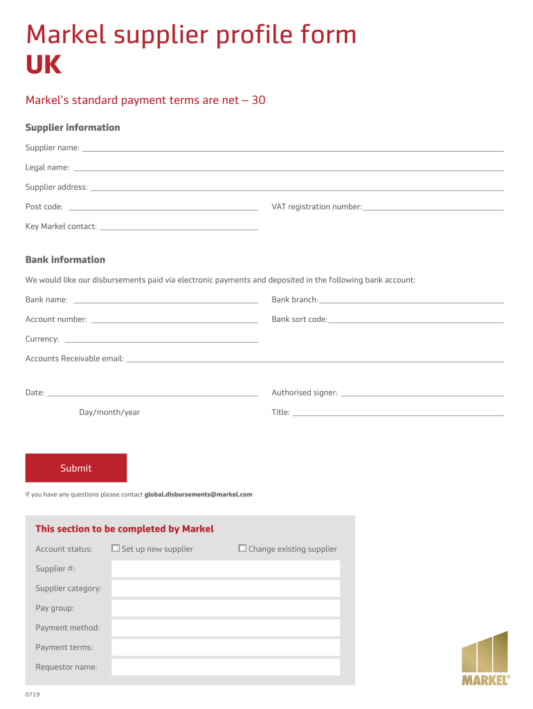 Market supplier profile form UK Markets standard payment terms are net 30 Supplier information Supplier names: Legal name: Supplier address: Post code: VAT registration number: Key Market contact: