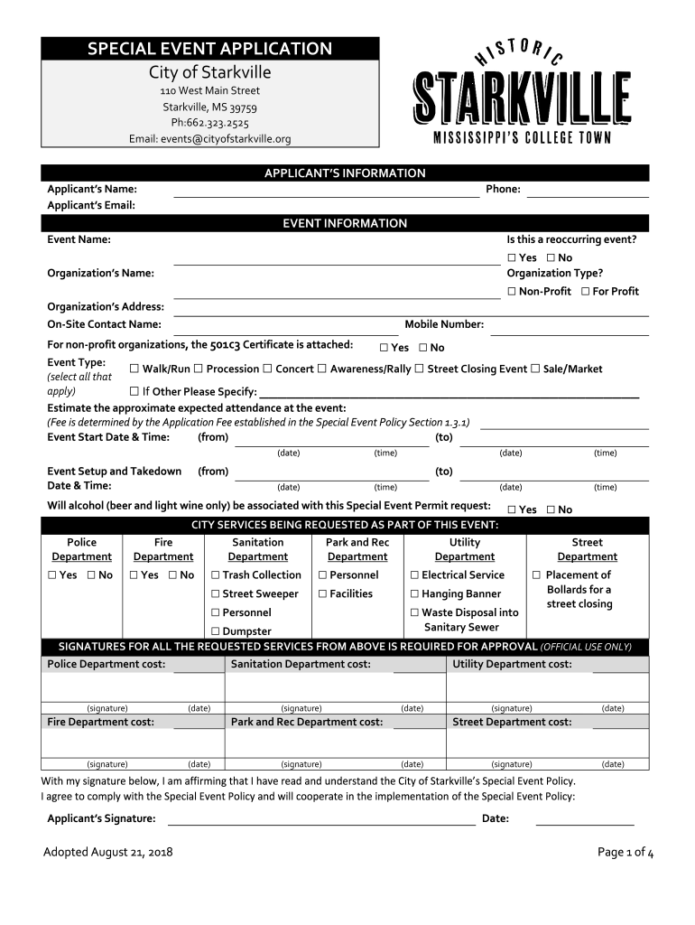 SPECIAL EVENT APPLICATION City of Starkville 110 West Main Street Starkville, MS 39759 pH:662.323.2525 Email: events cityofstarkville. Applicants INFORMATION Applicants Name: Applicants Email:Phone:EVENT