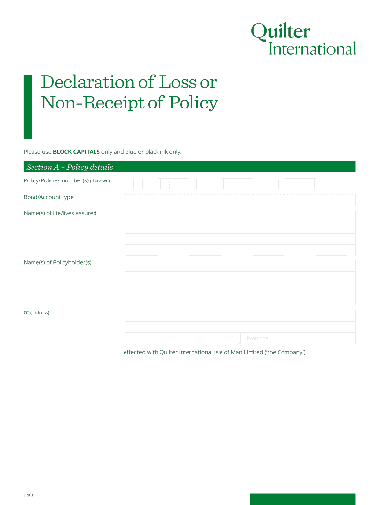 Declaration of Loss or NonReceiptofPolicy Please use BLOCK CAPITALS only and blue or black ink only. Section A Policy details Policy/Policies number(s) (if known) Bond/Account type Name(s) of life/lives