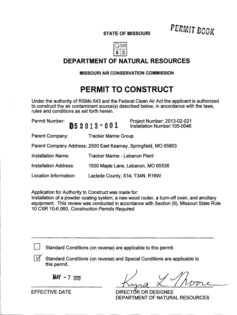 MISSOURI AIR CONSERVATION COMMISSIONPERMIT TO CONSTRUCTUnder the authority of RSM 643 and the Federal Clean Air Act the applicant is